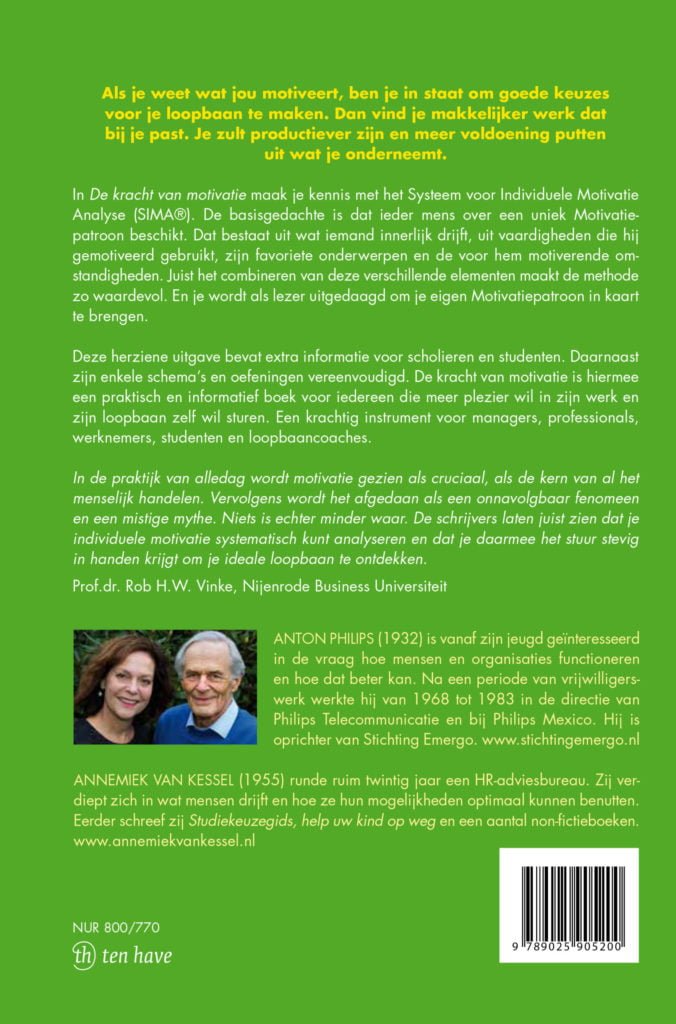 In De kracht van motivatie helpen Anton Philips en Annemiek van Kessel je op weg. Maak kennis met het Systeem voor Individuele Motivatie Analyse (SIMA®). De basisgedachte van SIMA® is dat ieder mens over een uniek Motivatiepatroon beschikt. Dat patroon bestaat niet alleen uit wat iemand innerlijk drijft, maar ook uit vaardigheden die hij gemotiveerd gebruikt en de omstandigheden waaronder hij het beste tot zijn recht komt. Als je weet wat jou motiveert, ben je in staat om goede keuzes voor je loopbaan te maken.